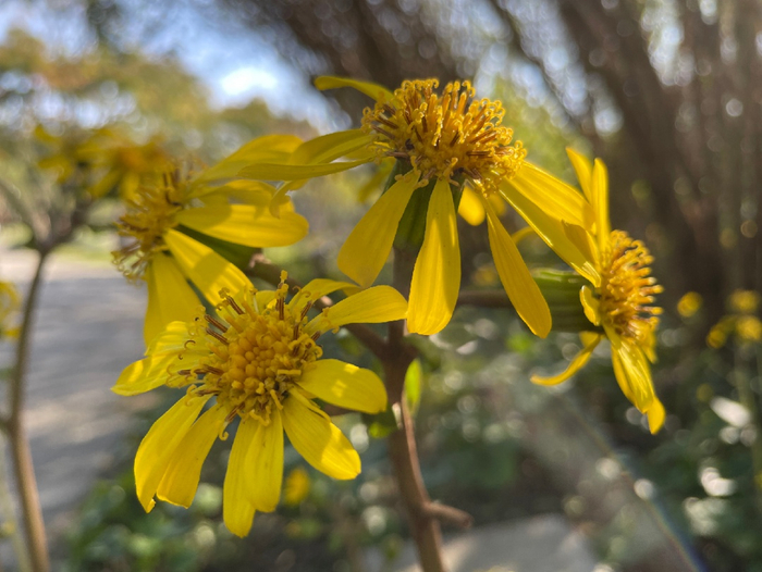 迎着瑟瑟秋风,方塔园内的大吴风草抽出花葶,绽放出朵朵黄花,身姿傲人。