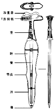 中国国家博物馆副研究馆员林硕介绍,中原地区包括长江中下游地区使用的青铜剑,其剑身较长,两侧刃基本平直,剑柄与剑身连铸,被称为“东周式剑”或“中原地区东周铜剑”;而在辽宁发现的青铜剑,剑身较短,且有柱状突脊,刃部弧曲,多有分铸的T形剑柄,柄上有石质加重器,被称为“双侧曲刃剑”或“东北系铜剑”,两者很容易区分。