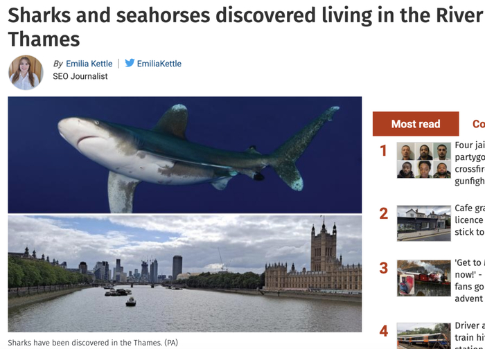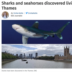 伦敦动物学会近期对泰晤士河进行了生态调查,并发布报告。他们发现河中除了鲨鱼,还有海豹、海鳗,就连对水质要求极高的海马都有活动记录。此前,还有研究人员称在泰晤士河里发现了数百头海豚,甚至偶尔还会有迷路的鲸鱼到访。而这些都是泰晤士河环境转好的重要指标。▲