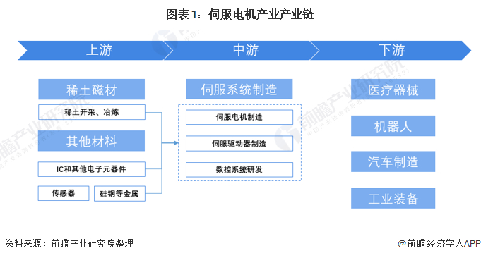 伺服电机行业的上游主要是原材料和电子零部件等其他材料供应商,由于伺服电机的工作原理,其稀土磁材是其制造过程中所必需的重要原材料,伺服电机制造处于整个伺服系统中的一部分,除伺服电机制造以外,伺服系统还包括伺服驱动器制造以及数控系统研发等环节。下游需求,伺服电机可以广泛应用于医疗器械、机器人制造、汽车制造和工业装备制造等领域,具有广泛的市场应用前景。