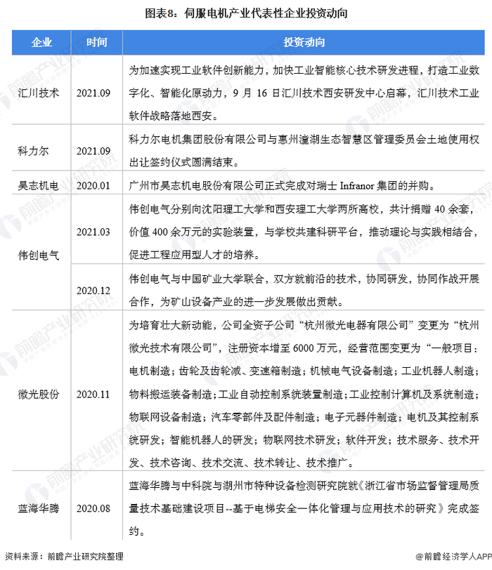 2020年以来,伺服电机产业代表性企业的投资动向主要包括收购公司拓展业务、通过对子公司增资的方式投资伺服电机生产基地项目。伺服电机产业代表性企业最新投资动向如下: