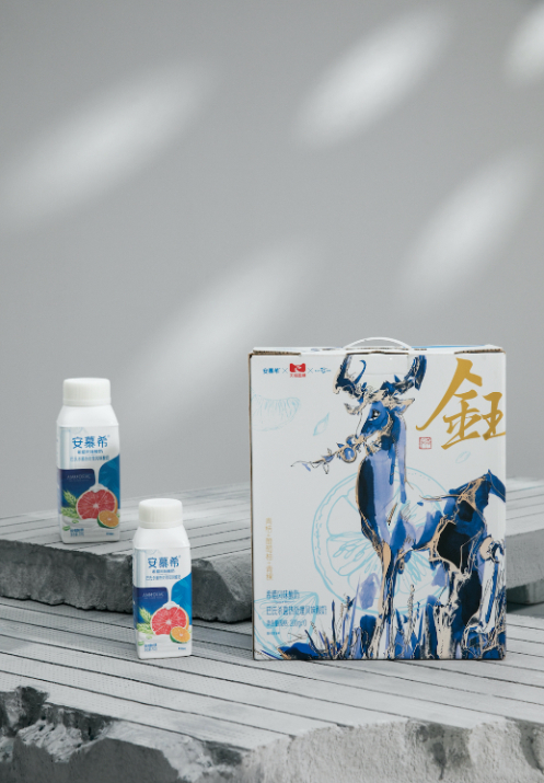 据了解,此次合作中,安慕希认领了艺术家任哲与非遗徽墨的联名作品《钰》,让作品登上招牌产品外包装。凭借浓郁口感及更多蛋白质营养,深受人们喜爱的伊利安慕希,通过引入风靡欧美日韩的希腊酸奶,旨在为人们带来更多营养与浓醇享受。而徽墨继承明清两代优良传统技艺,融合诸多珍贵配料、历经几十余道精细工序制成,有着落笔“一点如漆,万载存真”的特点。借助于非遗珍墨,艺术家任哲以其经典作品“元气淋漓”中温柔沉静的天鹿口衔青桔,轻盈立于青稞之上,角触葡萄柚,为安慕希寻觅最天然的配方,而温润的墨色则为其带来自然灵动之意。
