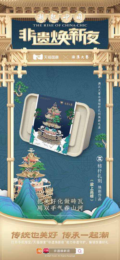 而为中华传承美食,以新国风文化为主塑造品牌形象的满汉大餐,与非遗传承概念完美契合,选择了结合“秸秆扎刻”非遗技艺,推出精美礼盒。超大的礼盒从内至外均采用秸秆的环保理念,内有整套满汉大餐6盒煮面,并赠送秸秆餐具一套,兼具精美与实用性。