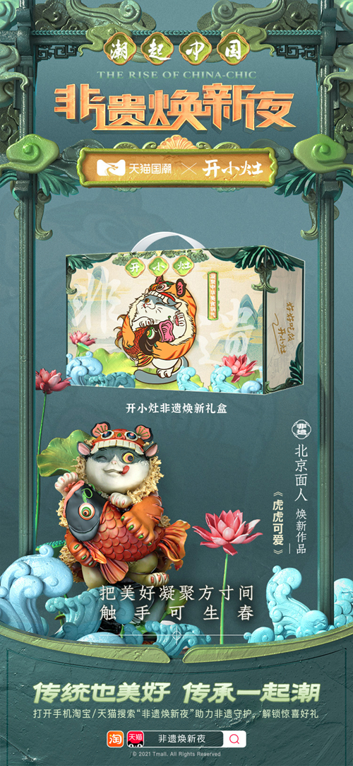 同样作为中华传统美食的品牌,开小灶一直以弘扬中华料理为己任,以成为国人的社会化厨房为愿景,其品牌名便是源于民间俗语"开小灶",意蕴"特别的关怀与照顾"。此次非遗专场,开小灶选择了面人曹第三代传人彭小平与独立艺术创作者贾叽合作创作的作品——《虎虎可爱》,将艺术家创作的手工捏制面塑形象,植入品牌经典的家常菜“土豆牛腩”的外包装上,在传递虎年有馀的美好寓意同时,让人们在忙碌的都市生活中感受家的温暖,生活的烟火气。