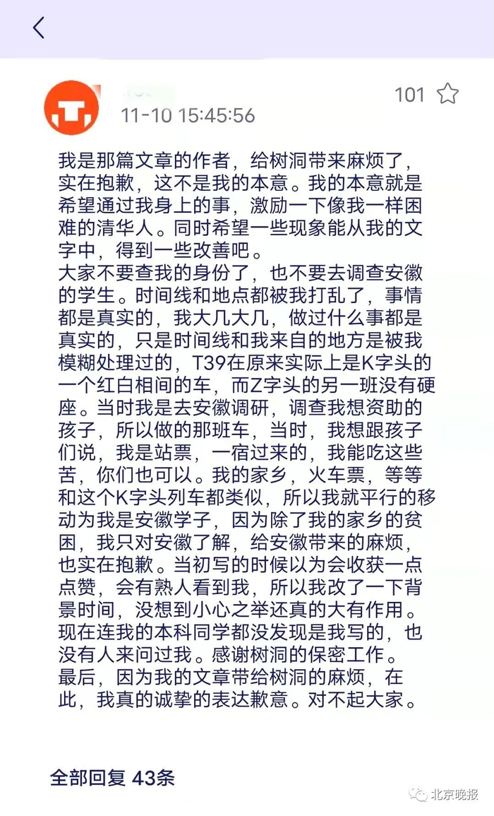 针对网友质疑最多的身份、列车车次等问题,该回复里表示:当时他是去安徽调研他想资助的学生,坐的文章中自述的这辆列车,而他的家乡、火车票等与这趟车都类似,所以他平行移动自己的身份为安徽学子。他这样做的原因,回复里解释称:“当时以为会有熟人看到,所以改了一下背景时间。”