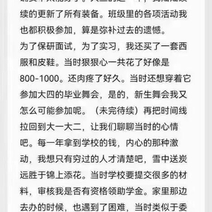 在这篇近5000字的自述中,这位同学描述了自己本科时经历过每月仅花400元的日子,在火车上坐一宿小马扎回家、在学校吃便宜的饭菜、两年当中不添置新的衣物、因为没有多余的钱而错过了班级组织的第一次集体活动……