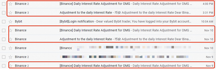 11月11日,有加密货币交易所币安用户向蓝鲸财经反映,近日以来,频繁收到OMG代币息费调整邮件。11日当天,币安杠杆平台将该代币的借贷日息上调至10%后,再度调至15%,较日前上涨近20倍。按调整后数据,普通用户借该币种的年化利率达到5475%。