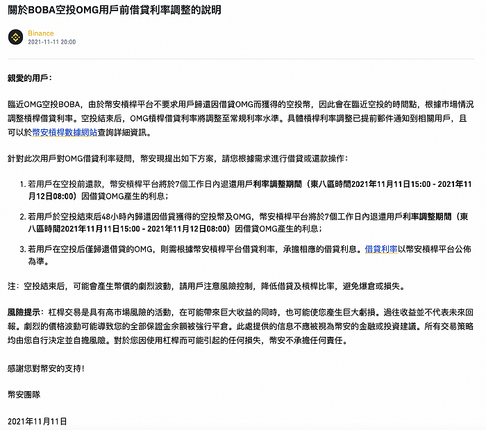 11月11日,在空投前一日,币安突然宣布暂停OMG提币,同时临时巨幅提息,变相迫使用户还币。当晚,币安发布公告称,临近OMG空投BOBA,由于币安杠杆平台不要求用户归还因借贷OMG而获得的空投币,因此会在临近空投的时间点,根据市场情况调整杠杆借贷利率。空投结束后,OMG借贷利率将调整至常规利率水平。