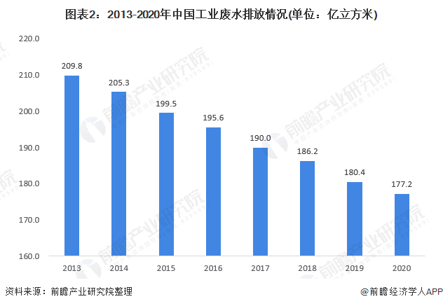 在我国工业用水量持续下降、工业废水处理能力和企业数量的不断增加以及工业废水再生利用水平的不断提高下,2010-2020年,我国对工业污染的治理已经取得了较大的进步,工业废水排放量总体上呈下降趋势。2020年工业废水排放量进一步下降为177.2亿立方米。但整体看来,我国工业用水量整体体量仍较大,工业废水处理行业仍面临较大的需求。