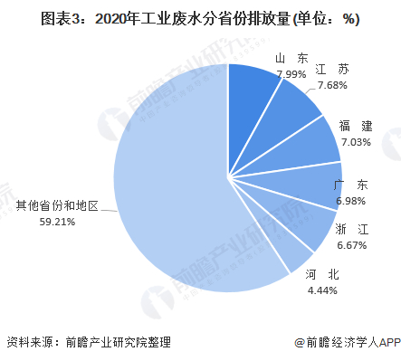 从行业区域竞争格局来看,前瞻通过各省份的各行业工业产值、工业用水量变化等数据测算得出2020年工业废水排放量前六大省份分别是山东省、江苏省、福建省、广东省、浙江省和河北省,分别占比7.99%、7.68%、7.03%、6.98%、6.67%和4.44%,合计排放占比达40.79%。