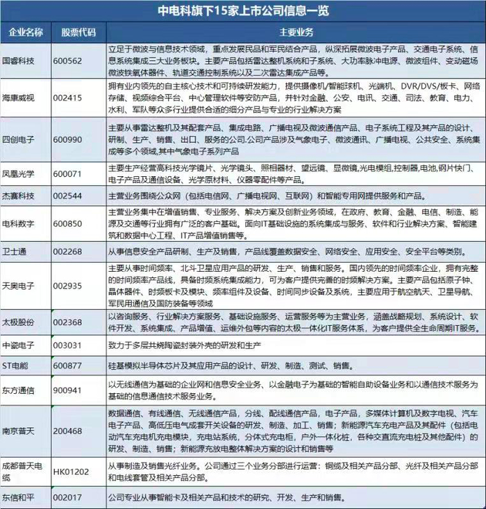 根据天眼查股权穿透显示,在今年6月23日,中国普天信息产业集团有限公司整体并入中国电子科技集团有限公司成为其全资子企业之后,中国电科旗下上市公司达到15家。其中包括国睿科技、海康威视、四创电子、凤凰光学、杰赛科技、华东电脑、卫士通、天奥电子、太极股份、中瓷电子、ST电能以及东方通信(东信B股)、南京普天(宁通信B)、成都普天电缆(成都电缆)、东信和平
