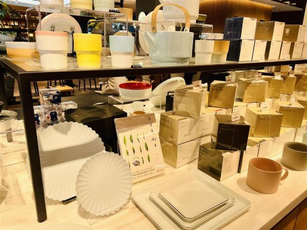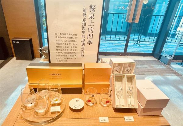 经过咖啡吧台,health(健康)主题区包含特色生活杂货,如中国茑屋书店限定的东京根本硝子工艺第三代传人根本幸昇打造的微型威士忌酒杯、有250年以上历史的日本传统工艺“木目込人形”之召唤美丽的猫,饮食、旅行等主题图书。书与杂货间隔摆放,体现了茑屋书店的“提案力”。