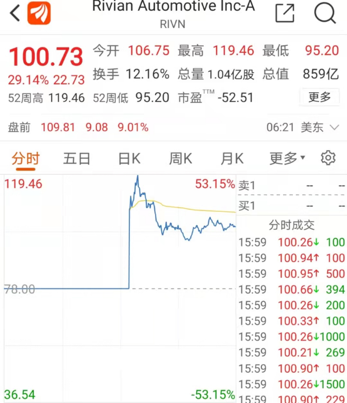 当天上市交易后,Rivian股价一度暴涨超过50%至119.46美元/股,市值一度突破1000亿美元。随后,Rivian回吐部分涨幅,截至收盘涨29.14%报100.73美元/股,市值为859亿美元,市值比肩通用汽车(861亿美元),超过了传统车企本田与福特,市值约等于蔚来汽车的1.3倍,理想汽车的2.9倍。