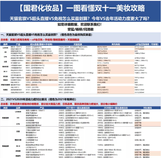 此外,国泰君安也推出了《一图看懂双十一美妆攻略》,不仅标出了各个品牌化妆品的最优购买渠道,还对去年和今年活动力度做了详细对比。
