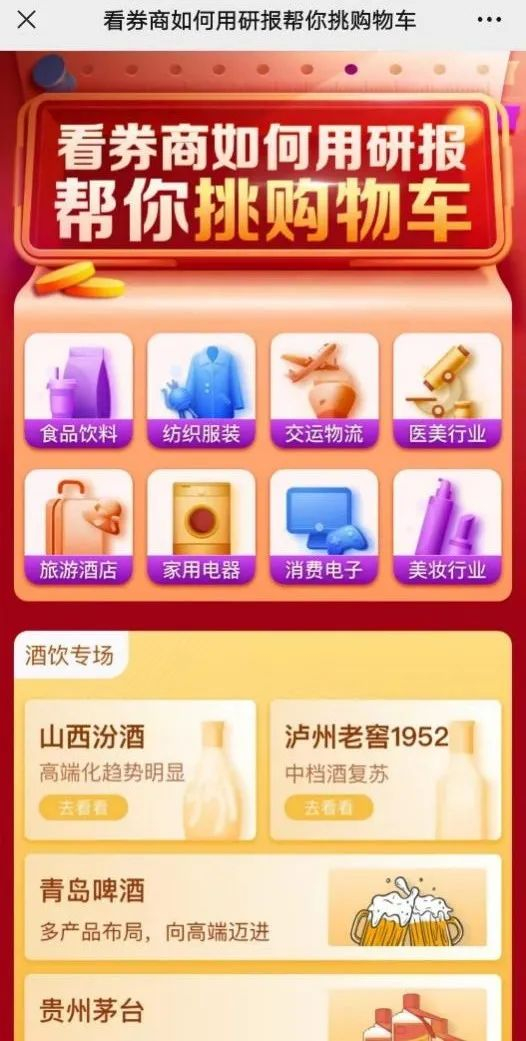 方正证券别出心裁推出了“如何用研报帮你挑选购物车”的活动。据了解,该活动本质上是收集了各家券商在家电、电子信息、旅游酒店、食品饮料、医疗行业、文化传媒等等各个行业的研报信息。活动的界面设置也比较像购物网站,投资者可以根据自己的兴趣点击各个行业,然后就会看到与此相对应的上市公司的研报。主要是一个研报的大集合。
