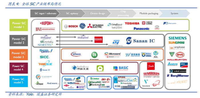 国际巨头具有领先优势,如现已更名Wolfspeed的科锐公司,已经完成碳化硅全产业链的覆盖,能够量产8英寸碳化硅衬底。