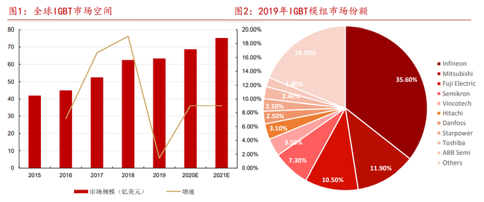 以硅基IGBT为例,全球IGBT等元器件目前仍以英飞凌、安森美、三菱、富士等为主。数据显示,2019年IGBT模组市场份额CR10占比81.10%,其中仅斯达半导为国内企业,占比仅2.50%。