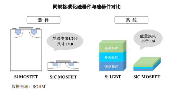 SiC出现后,由于具备耐高压、耐高频的特性,因此仅用结构更简单的MOSFET器件就能覆盖现在IGBT耐压水平,同时规避硅基IGBT的缺点,耗能更少。数据统计显示,相同规格的碳化硅基 MOSFET较硅基 IGBT 的总能量损耗可大大降低 70%。