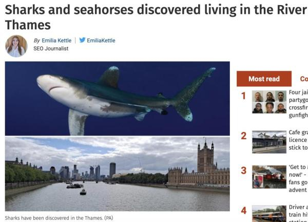 伦敦动物学会近期对泰晤士河进行了生态调查,并发布报告。他们发现河中除了鲨鱼,还有海豹、海鳗,就连对水质要求极高的海马都有活动记录。此前,还有研究人员称在泰晤士河里发现了数百头海豚,甚至偶尔还会有迷路的鲸鱼到访。而这些都是泰晤士河环境转好的重要指标。