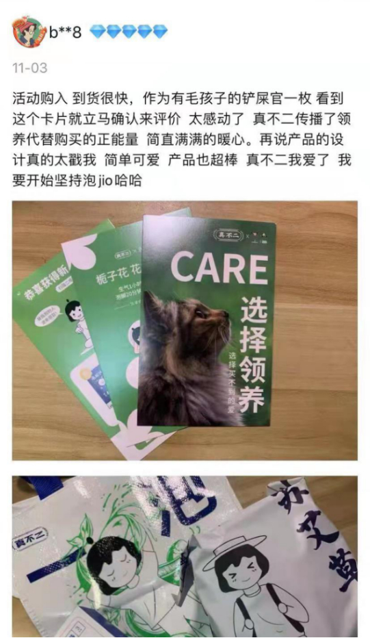 真不二在每个包裹上加附一个公益信息,每卖出一款特定产品,就累计一笔费用作为流浪动物保护资金。在立冬这样的寒冷节气,店铺首图也会更换,呼吁用户们关爱流浪动物、领养代替购买。