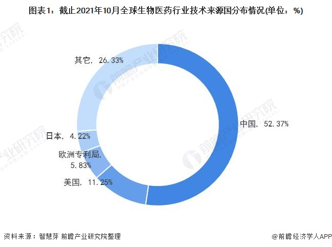 目前,全球生物医药第一大技术来源国为中国,中国生物医药专利申请量占全球生物医药专利总申请量的52.37%;其次是美国,美国生物医药专利申请量占全球生物医药专利总申请量的11.25%。欧洲专利局和日本占比分别为5.83%和4.22%。