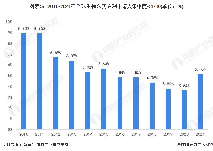 2010-2021年10月,全球生物医药专利申请人CR10呈现波动下降趋势,由2010年的8.93%波动下降至2021年10月的5.16%。整体来看,全球生物医药专利申请人集中度不高,且集中度呈现波动下降趋势。