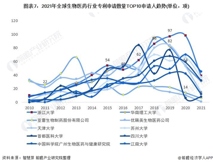 趋势方面,2010-2020年,全球前十大生物医药专利申请人申请的生物医药专利数差距不大,整体波动较大。2020年,浙江大学以98项成为生物医药专利申请最多的申请人;其次为华南理工大学,申请数量为54项。