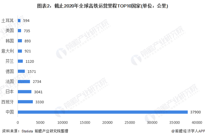 截至2020年,我国高铁运营里程处于全球领先地位,约为3.8万公里。排名前五的国家还包括西班牙、日本、法国、德国,高铁运营里程分别达到3330公里、3041公里、2734公里及1571公里。