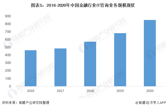 2016-2020年,中国金融行业IT咨询市场需求呈稳步增长态势。银行IT咨询的业务从2018年开始经历了高速的增长,目前,大型股份制银行已经基本达到业务自动化和便利化,未来发展的机会在中小银行;随着资管新规的出台,证券IT咨询业务的需求将会得到释放。根据市场规模测算,2020年,中国金融IT市场规模达到851亿元。