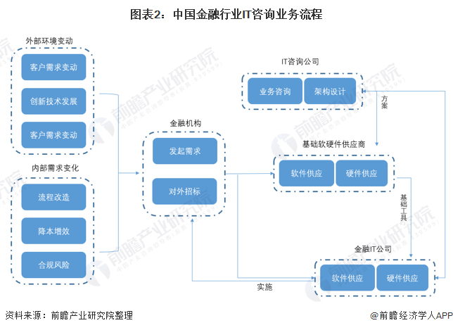 金融IT咨询业务多起源于外部环境和内部环境的改变,促使金融机构提出需求并对外招标,市场中的IT咨询公司连同基础软硬件供应商共同合作,满足金融公司的信息化需求。目前,由于市场上金融机构需求不一,产品难以标准化,尤其是核心业务系统更需适配客户需求,因此行业具有进入壁垒高、客户黏性强、偏定制化的特点。
