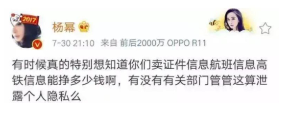 信息被泄露,往往给本人带来相当大的困扰。杨幂就曾在微博吐槽过“有时候真的特别想知道你们卖证件信息航班信息高铁信息能挣多少钱啊,有没有有关部门管管,这算泄露个人隐私么”。有的粉丝会买跟艺人同一班飞机,并“帮忙”值机,以和艺人距离更近。