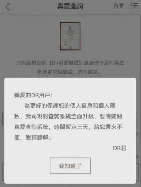 根据爆料消息,此事系一位微博网友用偶像的身份证号在该钻戒的“真爱查询”系统进行查询,想看看其是否有购买钻戒记录,没想到竟然真的查到。之后,事件发酵,已有12位艺人被扒出有过购买记录。