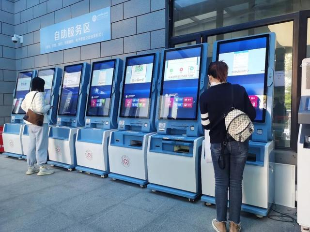 自助服务区设置在室外连廊里,这里有7台自助挂号机,方便患者快速完成查询、预约、挂号等操作,减少排队等候时间。热心的志愿者从旁引导、协助患者正确使用自助机。