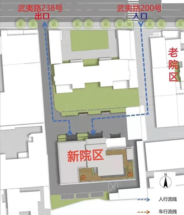 目前根据新冠疫情防控要求,进入院区施行单向流动管理。其中,武夷路200号为医院入口,武夷路238号为医院出口。
