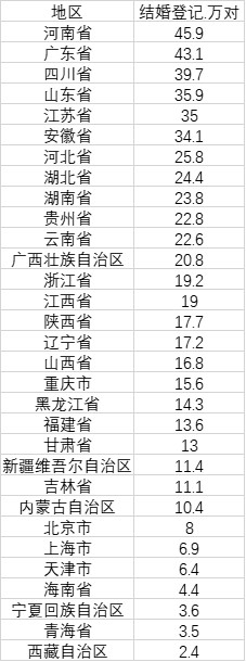 从各地的数据来看,今年前三季度,结婚登记对数最多的10个省份是河南、广东、四川、山东、江苏、安徽、河北、湖北、湖南和贵州。其中,河南和广东超过40万对,河南以45.9万对位居第一。由于结婚、离婚登记都与户籍紧密联系的,河南户籍人口全国最多,因此结婚人数最多也在情理之中。