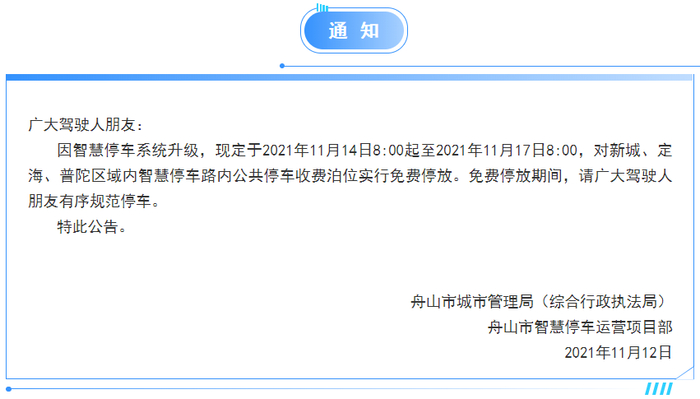 “千岛停车”微信公众号消息:因智慧停车系统升级,现定于2021年11月14日8:00起至2021年11月17日8:00,对新城、定海、普陀区域内智慧停车路内公共停车收费泊位实行免费停放。