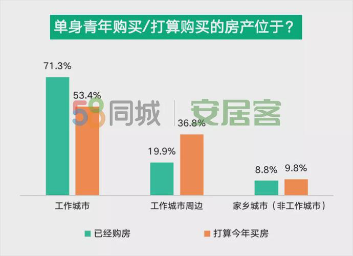 本次调研的单身青年均工作在一线和新一线城市,报告显示,参与调研的单身青年中,有17.4%的人表示已经购房,71.3%已购房的单身青年都选择了在工作城市购房。此外,整体调研人群中有55.5%的单身青年有购房规划。今年有购房计划的单身青年中,倾向在工作城市购房的人群占比在53.4%,倾向于在工作城市周边购房的占比36.8%,高于已购房的单身人群。