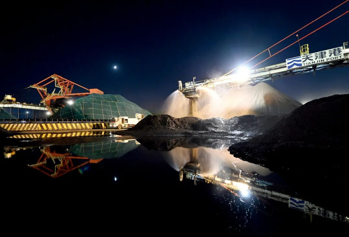 10月11日夜晚,天津港煤码头总长度达17公里的输煤皮带持续运行,电煤船舶停靠在码头进行装船作业,保障煤炭运输。图/新华