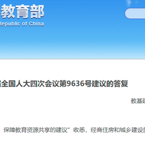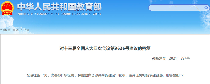 近日,教育部在答复十三届全国人大四次会议第9636号建议“关于改善炒作学区房,保障教育资源共享的建议”时表示,“学区房”的出现在一定程度上反映了优质教育资源配置不均衡、校际间办学质量存在差异的问题。教育部高度重视这一问题,一手推进均衡发展、着力缩小校际差距,一手推进多校划片、治理择校和规范招生入学秩序,取得了明显成效。