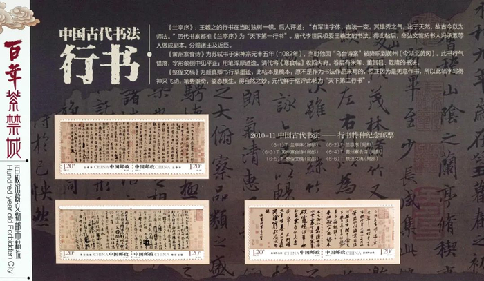 邮册中的三枚书法邮票内容分别为《兰亭序》、《祭侄文稿》、《黄州寒食帖》。文化底蕴深厚,观赏度很高。
