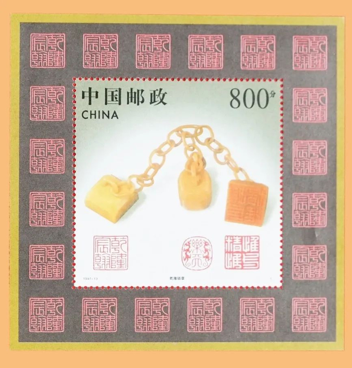 这张寿山石雕邮票中的“乾隆链章”是故宫博物院内所藏、溥仪捐献的带链田黄石印 章(乾隆遗物),被视为“宫中瑰宝”,难得一见。