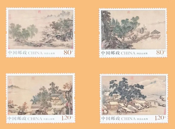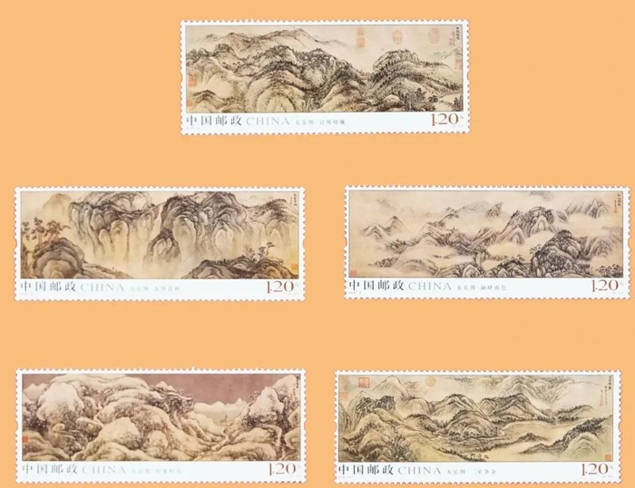 稀世名画《五岳图》邮票设计完整,展现了《五岳图》图卷的原貌,颜色古朴厚重,设计简洁大气,整体风格清新雅致。