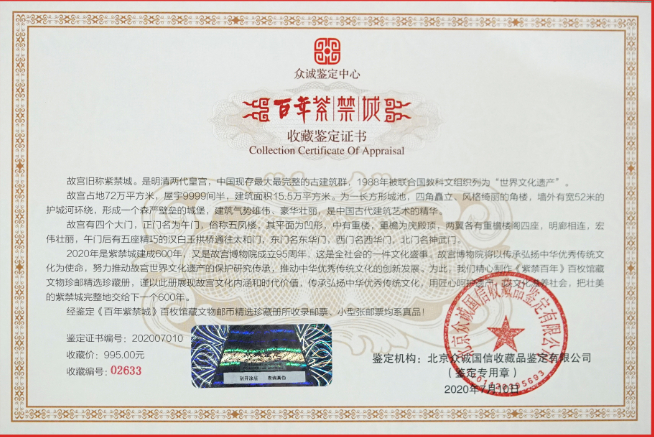 每张认证都由权威性专业鉴定公司北京众城国信收藏品鉴定有限公司盖章官方认证。保真、保值,值得收藏。