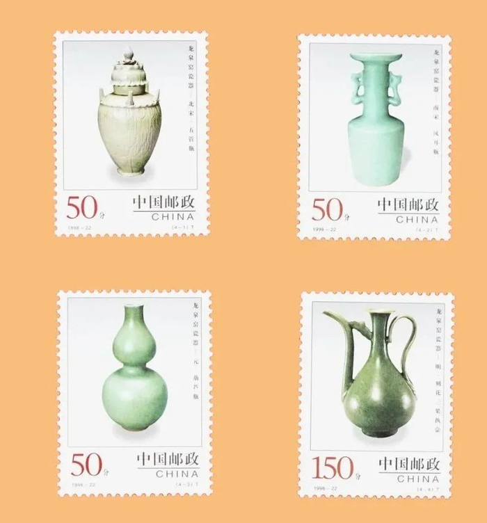 这组龙泉窑邮票图中的四个瓷器都是具有代表性的,外形端正,色青,受到众多瓷器收藏家的喜爱。