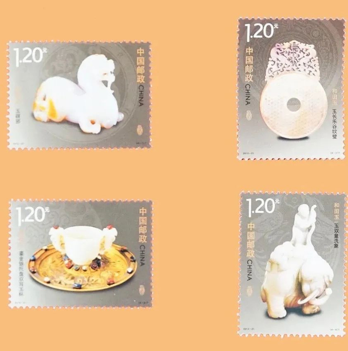 邮票中的图案是我国四件古代和田玉玉器珍品。这套邮票以出土的和田玉文物图片及历史为主线,展现出和田玉的历史文化变迁。
