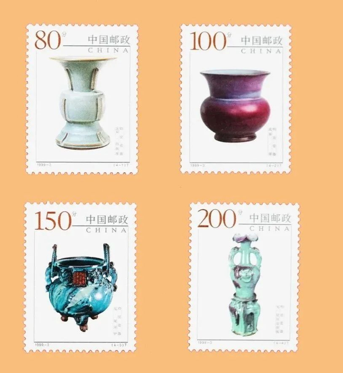 这是中国首套钧瓷邮票。中国钧窑瓷器是宋代五大名窑之一。