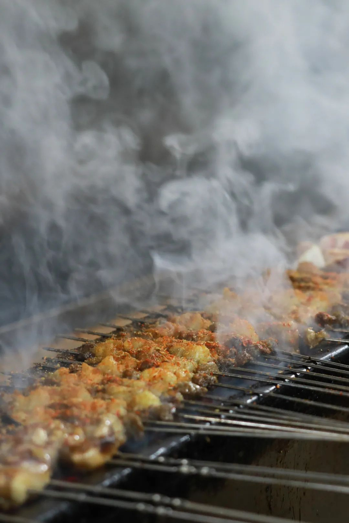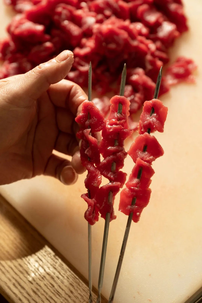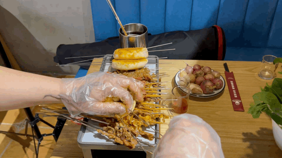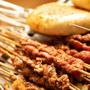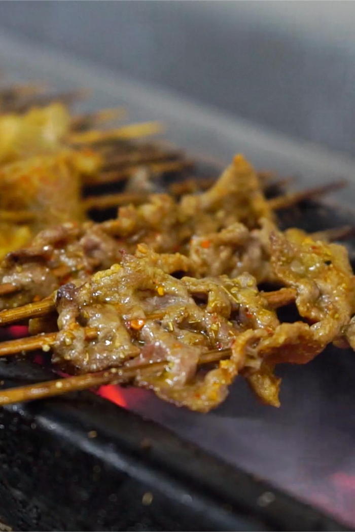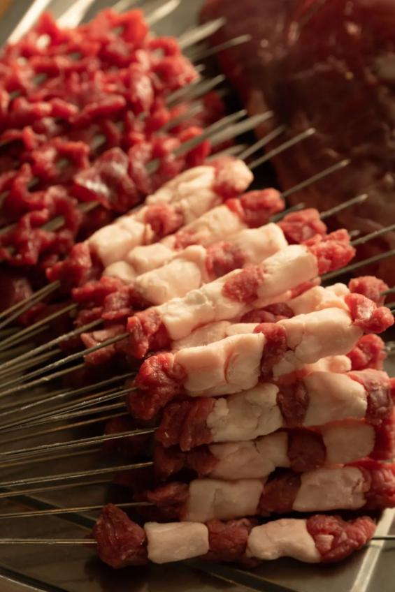 它以牛肉串为主,可以根据个人口味选择几分熟——对,和西餐的牛排一样,三五七分到全熟,随你挑。“三分熟”是牛肉串的经典吃法,牛肉在炭火中迅捷而过,被烟火气拥抱却不浸染,口感依旧鲜嫩无比;搭配特制的小料,感受细嫩肉质在舌尖跳动,想想就流口水。