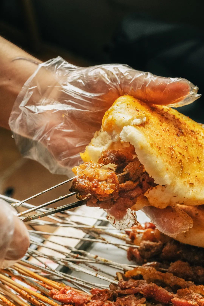 当然,这种嫩,你必须亲口尝过才知道。在鹤岗,最地道的小串吃法是:一口烤肉,一口毛葱,再配上当地的特色饮料“爽花小香槟”,满嘴皆是祖国北端的生猛。至于主食,一定要点鹤岗烧饼,软香的发面饼烤得酥脆,夹上鲜嫩味足的肉串,一口下去,人间只剩美好。