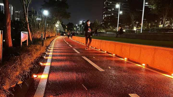 此外,这条智慧跑道还有一段百米长的特色跑道,每到夜间,两侧的变光式地灯可以做到人员跑过变色,带给市民更美好的体验。