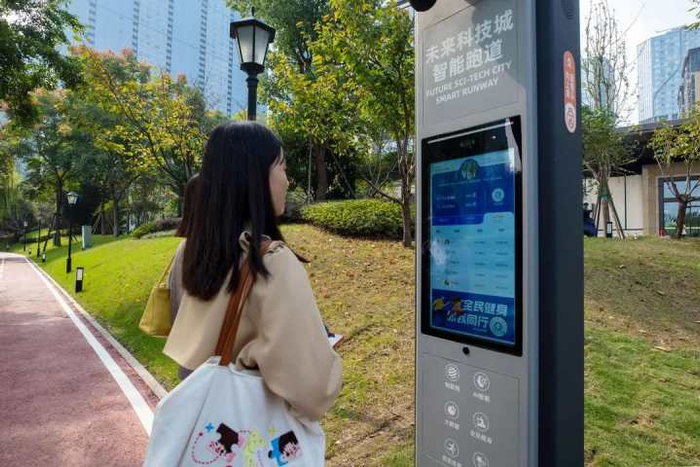 跑道上每隔300米左右,设置有5根AI智慧杆。这些智慧杆不仅可以自动进行智慧识别打卡,还能记录使用者的奔跑速度、距离和各种运动数据。市民不用带手机就能知道自己跑了多少公里,真正实现“轻装上阵”。